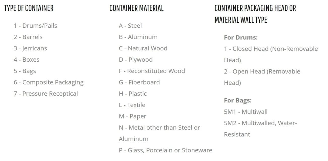 De første tre sifrene indikerer hva slags type beholder det er, hva den er laget av og lokkalternativer for fat. Beholderen over er dermed et fat laget av plast som har en åpning på samme diameter som beholderen, også kalt open-head drum.
